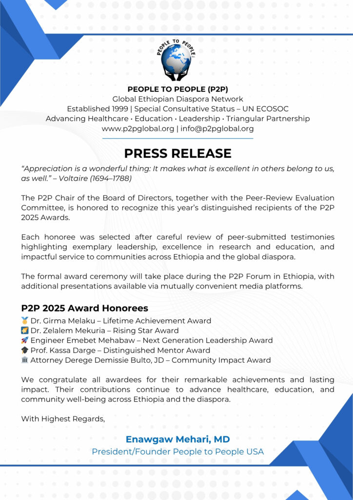 People to People (P2P) proudly announces the 2025 Award Honorees, recognized for outstanding leadership, community impact, and service across Ethiopia and the global diaspora.