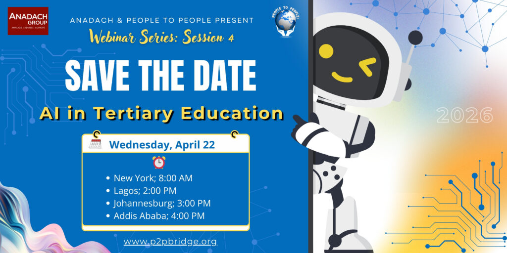 AI Webinar 3 AI Webinar 3 AI Webinar 3 AI Webinar 3 AI Webinar 3 AI Webinar 3 AI Webinar 3 AI Webinar 3 AI Webinar 3 AI Webinar 3 AI Webinar 3 Today, February 25, People to People (P2P) in collaboration with Anadach successfully conducted the third session of the AI in Higher Education webinar series. The session highlighted how AI is transforming teaching, learning, and institutional innovation. Thank you to everyone who participated!  Wednesday, February 25 8:00 AM – 9:30 AM (EST) Virtual Registration Link:https://us02web.zoom.us/meeting/register/11Iaio31QvysPfEfxyx8TQ Opening remarks: Dr. Bekalu Wubshet Zewdie – Chief Executive Director/Vice President/ College of Medicine and Health Sciences / Tibebe Ghion Specialized Teaching Hospital, Bahir Dar University ​Moderators: Dr. Kechi Achebe – MD, MPH, Global Health & HIV expert Dr. Berhanu Alemayehu – Assistant Professor of Professional Practice at the Rutgers Business School Speakers: Ms. Vamshi Lingampally – Co-founder of SoZoAI Mr. Rediet Tsigeberhan – Arifpay CEO Dr. Asad Mian – Head of Healthcare Transformation, Learning Programs & Systems, Evercare Group (Pakistan, Nigeria & Kenya) Dr. Esther Oshunluyi  –  Nurse educator, global health leader, and health systems strategist Ms. Manahat Thomas – Founder & Systems Builder | AI, Education & Social Impact ​ Program: 8.00am – 8.10am Welcome Remarks – People to People (P2P) & Anadach 8.10am – 8.15am Opening Remarks – Dr. Bekalu Wubshet Zewdie, Chief Executive Director/Vice President College of Medicine and Health Sciences / Tibebe Ghion Specialized Teaching Hospital, Bahir Dar University 8.15am – 8.25am  Introductory Remarks – Basic Primer for understanding AI models and potential applications in Health care – Ms. Vamshi Lingampally, Co-founder of SoZoAi 8.25am – 9.00am Panel 1: AI impacting the health sector at scale Moderator | Dr. Berhanu Alemayehu, Director, Health Economics and Outcomes Research at AstraZeneca Panelists: Mr. Rediet Tsigeberhan, Fintech Visionary and Arif Pay CEO Ms. Manahat Thomas, CEO & Co- of Cronos EdX Ms. Helen Adeosun, CEO and Founder of CareAcademy (TBC) Audience engagement managed by moderator 9.00am – 9.25am Panel 2: AI in Training and Capacity Enhancement Moderator | Dr. Kechi Achebe, Executive Leader Panelists: Dr. Asad Mian, Head of Healthcare Transformation, Learning Programs & Systems of The Evercare Group Dr. Esther Osunluyi, Nurse educator and Global Health Leader Audience engagement managed by moderator 9.25am – 9.30am Closing Reflections – Dr. Iziaq Adekunle Salako, Minister of State for Health and Social Welfare, Federal Republic of Nigeria (TBC) ​ Dr. Bekalu Wubshet Zewdie Chief Executive Director/Vice President/ College of Medicine and Health Sciences / Tibebe Ghion Specialized Teaching Hospital, Bahir Dar University MD, FCS (Ped-Orth, ECSA), Assistant Professor of Orthopedic Surgery, and Consultant Pediatric Orthopedic Surgeon certified by the College of Surgeons of East, Central, and South Africa. An experienced clinician and health system leader, skilled communicator, and dedicated team player, capable of leading and collaborating effectively. Dr. Esther Oshunluyi Nurse educator, global health leader, and health systems strategist Dr. Esther Oshunluyi is a nurse educator, global health leader, and health systems strategist with extensive experience in nursing education, population health, and health workforce development. She has contributed to curriculum strengthening, faculty development, and institutional capacity building at the Edo State College of Nursing Sciences and the Edo State College of Health Sciences and Technology, supporting innovation in health professions education within low- and middle-income settings. Esther’s work integrates leadership, policy, and technology to improve healthcare delivery and education, with a growing focus on the ethical and practical application of artificial intelligence in nursing practice, education, and health system efficiency. Dr. Oshunluyi trained as a nurse in Nigeria, obtained her Master’s and Doctoral degrees in the USA in Nursing Administration and Population Health leadership from the University of California, Los Angeles (UCLA), and the University of San Francisco, California respectfully. Dr. Oshunluyi brings a strong nursing perspective to global conversations on AI, equity, and the future of healthcare education in Africa and beyond. Dr. Berhanu Alemayehu Assistant Professor of Professional Practice at the Rutgers Business School Dr. Berhanu Alemayehu, DrPH is a health economist, applied statistician, and educator with over 20 years of experience in health economics, outcomes research, and advanced analytics. He currently serves as Assistant Professor of Professional Practice at Rutgers Business School, teaching Business Statistics and Enterprise Architecture. He has also taught statistics at Rutgers University, Baruch College (CUNY), Lansing Community College, and the University of Texas. ​ Dr. Alemayehu earned his doctorate in Health Economics and Health Policy from the University of Michigan and holds an MS in Mathematical Statistics from the University of Texas. In addition to his academic career, he has held senior leadership roles at Merck, AstraZeneca, Novo Nordisk, and Medco Health Solutions, leading teams and conducting clinical and real-world data analyses across multiple therapeutic areas. ​ His research has had national impact, including work cited in the 2012 U.S. Supreme Court Affordable Care Act decision. He combines rigorous analytical expertise with practical industry leadership to inform healthcare policy and decision-making. Dr. Kechi Achebe MD, MPH, Global Health & HIV expert Dr. Kechi Achebe is an experienced public health physician, scientist, and researcher, with more than 20 years of technical, programmatic, and leadership experience in public health and clinical medicine. A recogn